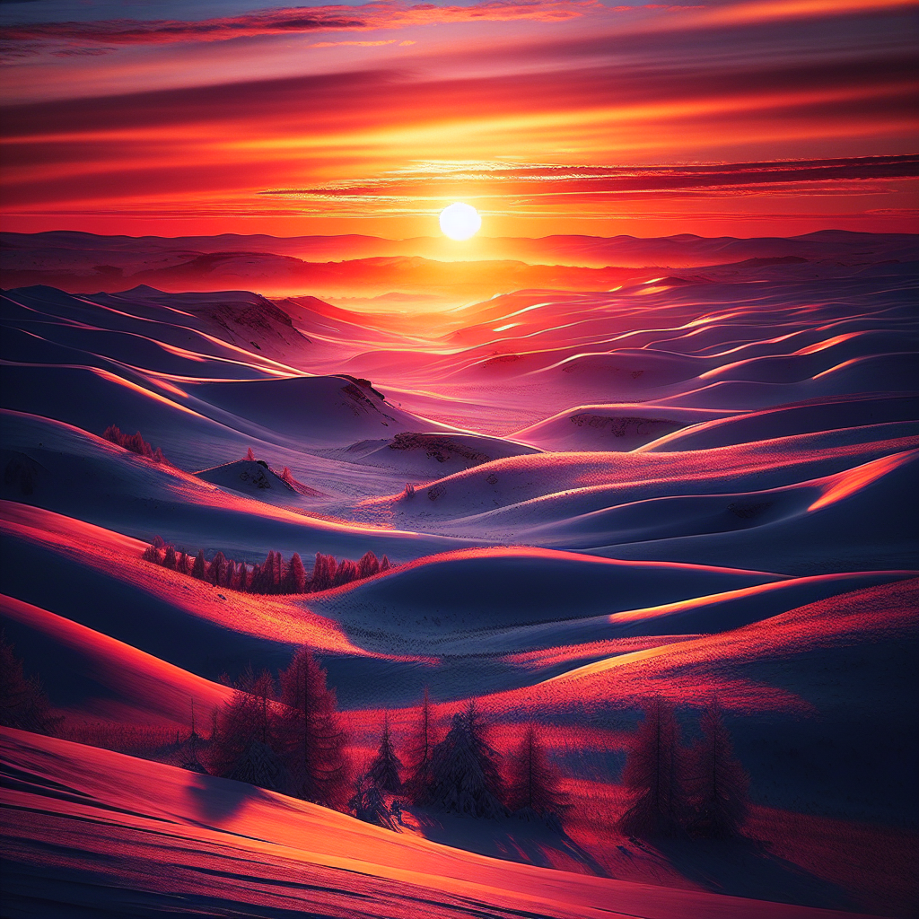 a beautiful sunset around snowy hills